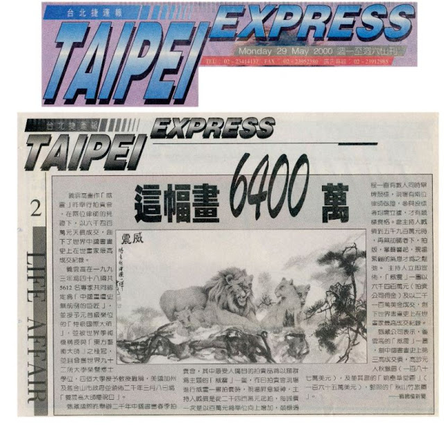 甄藏公司表示,义云高(H.H. 第三世多杰羌佛 )的「威震」一图,创中国书画史上第三高成交价,高于元人秋猎图(一百八十七万美元),及董其昌的「婉峦草堂图」(一百六十五万美元),郭熙的「秋山竹旅图」。—编辑台新闻