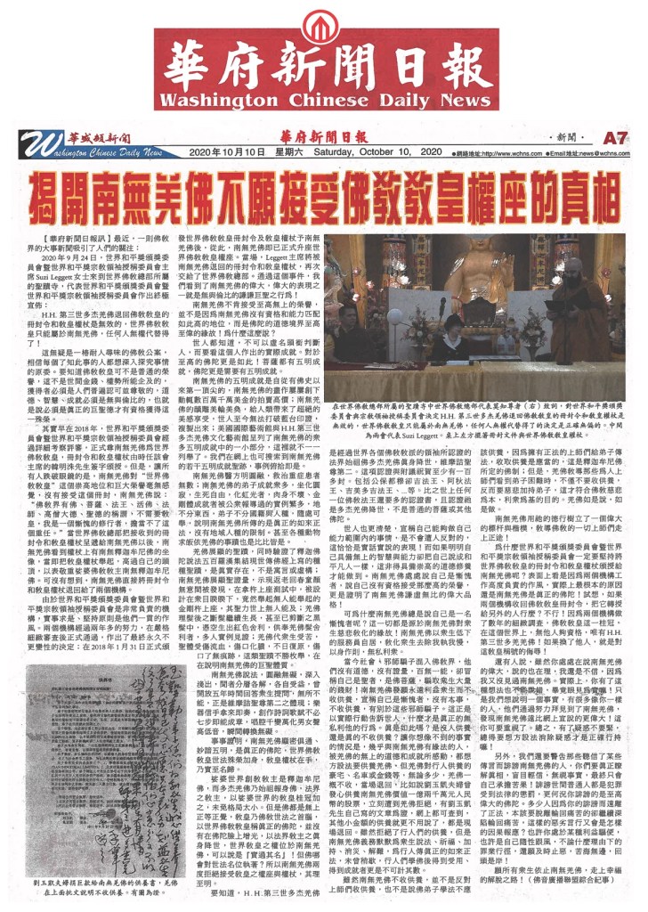2020年9月24日,世界和平獎頒獎委員會暨世界和平獎宗教領袖授稱委員會主席Suzi Leggett女士來到世界佛教總部所屬的聖蹟寺,代表世界和平獎頒獎委員會暨世界和平獎宗教領袖授稱委員會作出終極宣佈:
