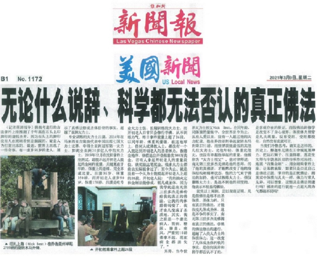 另外,当今世界大力士祖父Nick Best,在同年龄、同体重的量级中,全世界至今为止,从有人类以来,没有一人超过他的大力纪录。他在乔治亚州举起旋转木马升降2791磅,而世界顶级最强的其他几位大力士,比他年轻、体重比他大,也没有举起他举起的重量,他被称为“大力士祖父”。他对律师说:南无 第三世多杰羌佛 是他的恩师,传了他的真佛法,才断然改变了他的身体结构和精神状态,他的力气来于佛法的加持。他可以教练大力士,但仅靠练大力士,是达不到他的程度的。他表示不轻易传佛法。