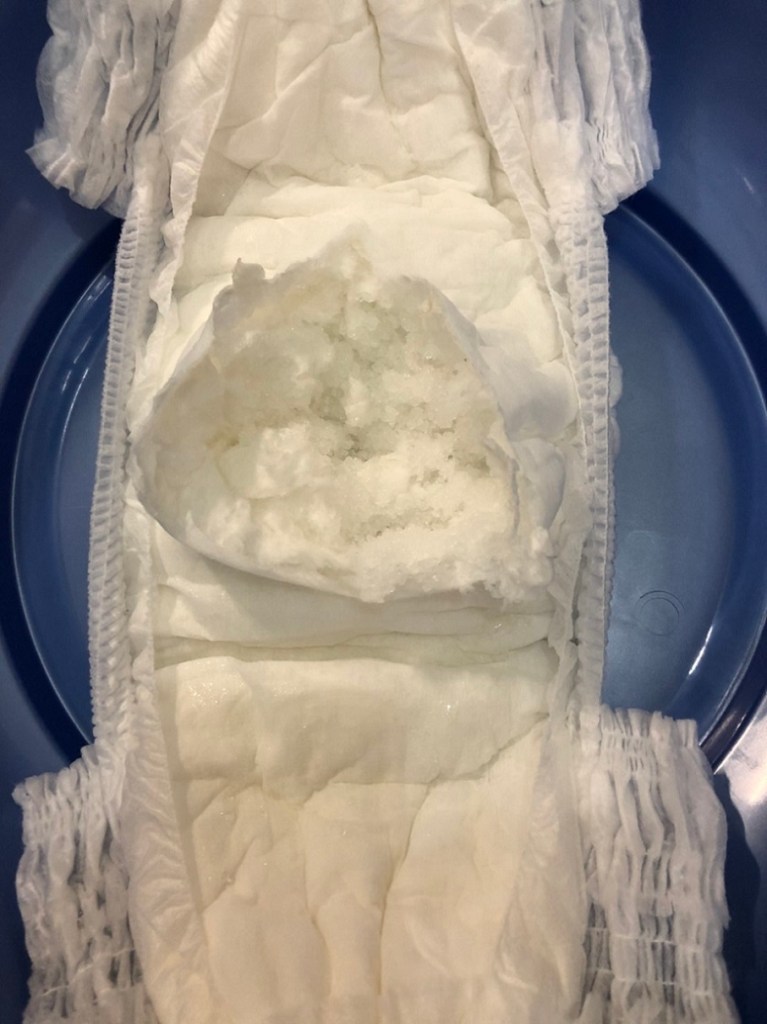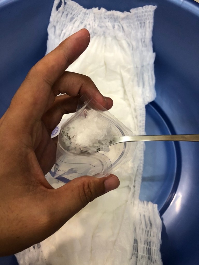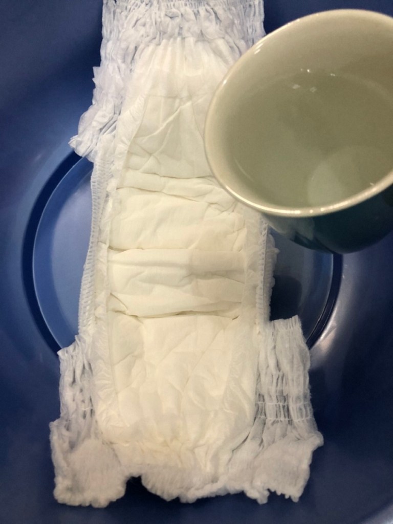 準備水將水倒進尿布中,讓尿布吸水,直到尿布無法吸水,並將多餘的水倒掉