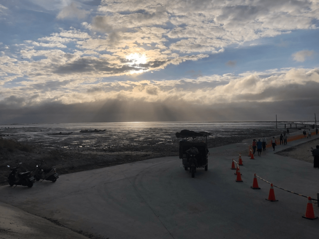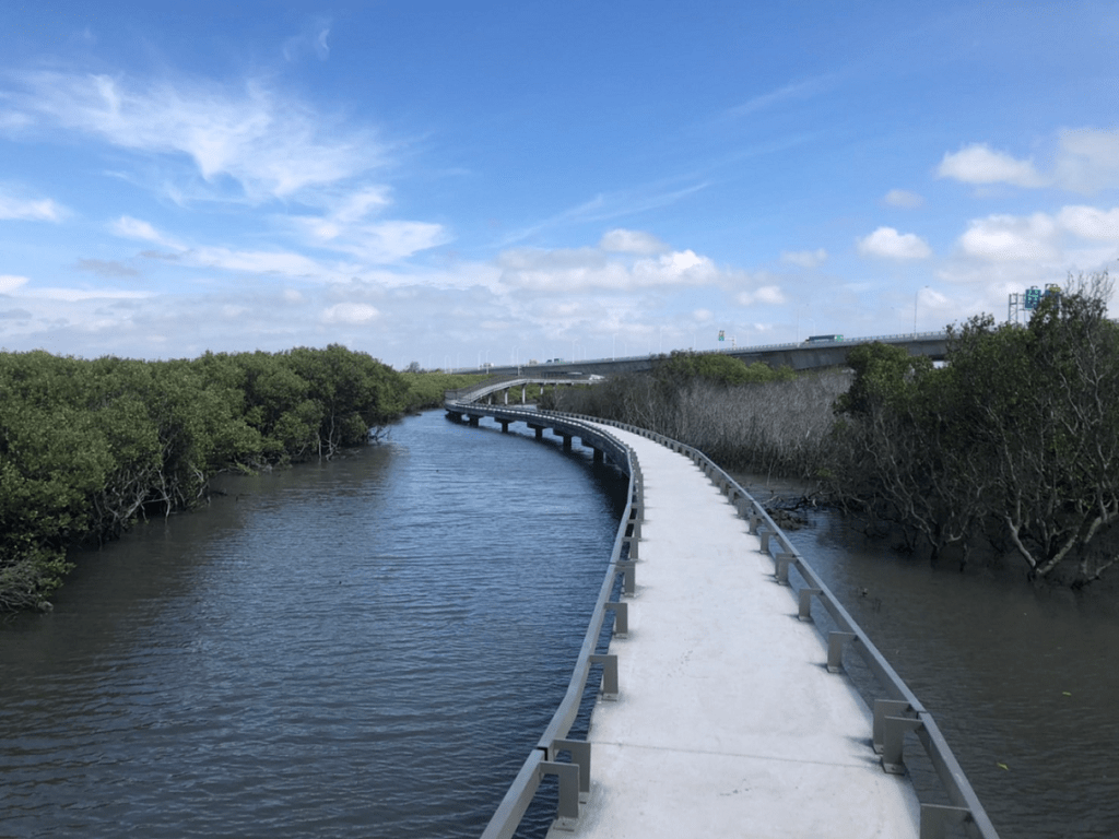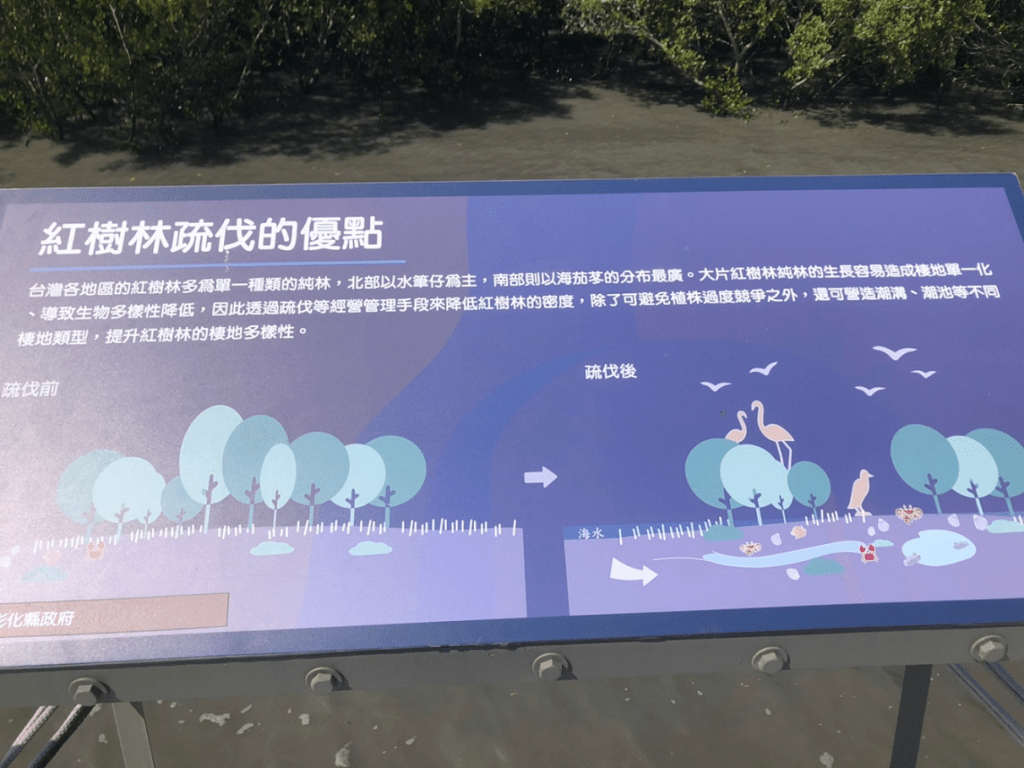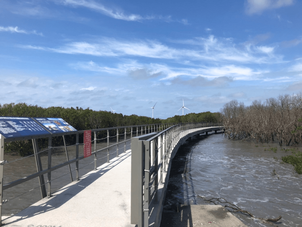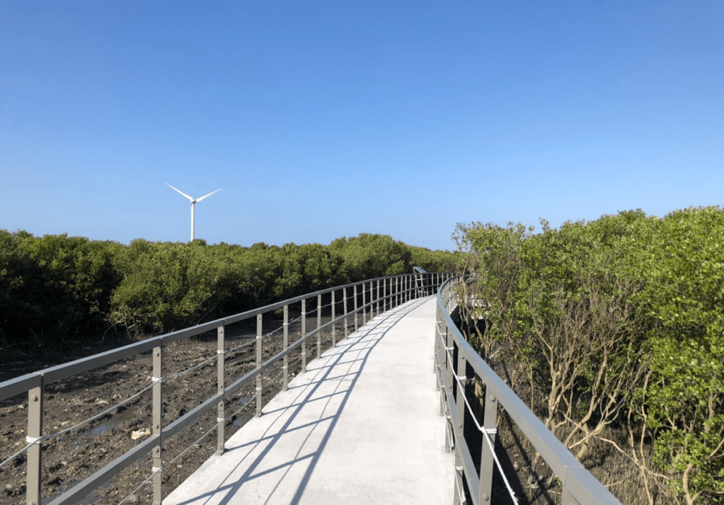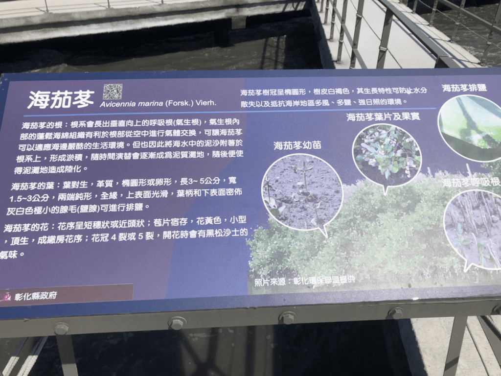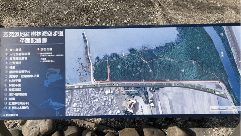 彰化芳苑海空步道是彰化的新景點,歷時四年終於完工,海空步道全長約1公里穿梭在紅樹林中,進出口共有三個,我們是從最左邊的步道入開始進入,由於來的時候沒有注意到潮汐的問題,結果走在步道上就只能看到兩邊的紅樹林,無法看到潮間帶的生態。去海空步道前,可以先上網查查潮汐時間表,才不會沒看到想看到的景色哦。