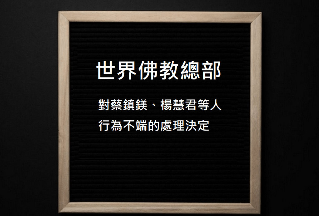 鑑於蔡鎮鎂、楊慧君二人咆哮大殿、毆打他人的行為,在佛弟子中造成了極為惡劣的影響,她們的言行已經嚴重背離了佛陀的教導,喪失了佛教徒必須具備的基本道德和修行原則,同時,經總部聖德組審查,她們二人已經嚴重退道。故世界佛教總部作出決定:撤銷蔡鎮美、楊慧君二人的仁波且身份,免去她們二人的所有藍釦和黑釦段位。從即日起,此二人嚴禁踏入聖蹟寺。如若她們公開真誠懺悔並重新申請,總部將在嚴格審查他們的言行並考試後,再決定她們的身份段位。