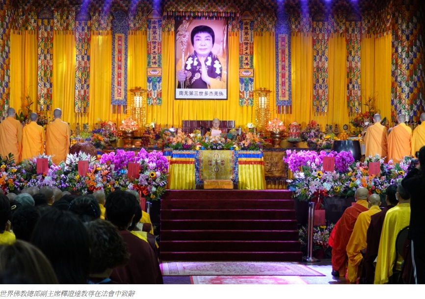 世界佛教總部副主席釋證達教尊在法會致辭中說到:「我見到眾多的七眾佛弟子們,都在更加虔誠地遵照南無第三世多杰羌佛佛陀恩師的教導,諸惡莫作、眾善奉行,盡自己的力量實際地去幫助了眾生、利益到眾生,慈悲地長期救護、放生各種物命,虔誠地恭聞佛陀恩師說法的法音和恭讀經書,積極地無畏護法,明信因果,修正自己的行為,真實地護持、弘揚南無第三世多杰羌佛和南無釋迦牟尼佛的佛陀正法,真正做到了讓更多的眾生得以修學到南無第三世多杰羌佛親自傳承下來的完美的佛陀正法,福慧增長,建立了相應的實際的功德。只要大家始終如一勇猛精進,那大家的解脫成就就不必擔心、不在話下了,眾生的解脫和幸福,正是南無第三世多杰羌佛和十方諸佛的希望。」